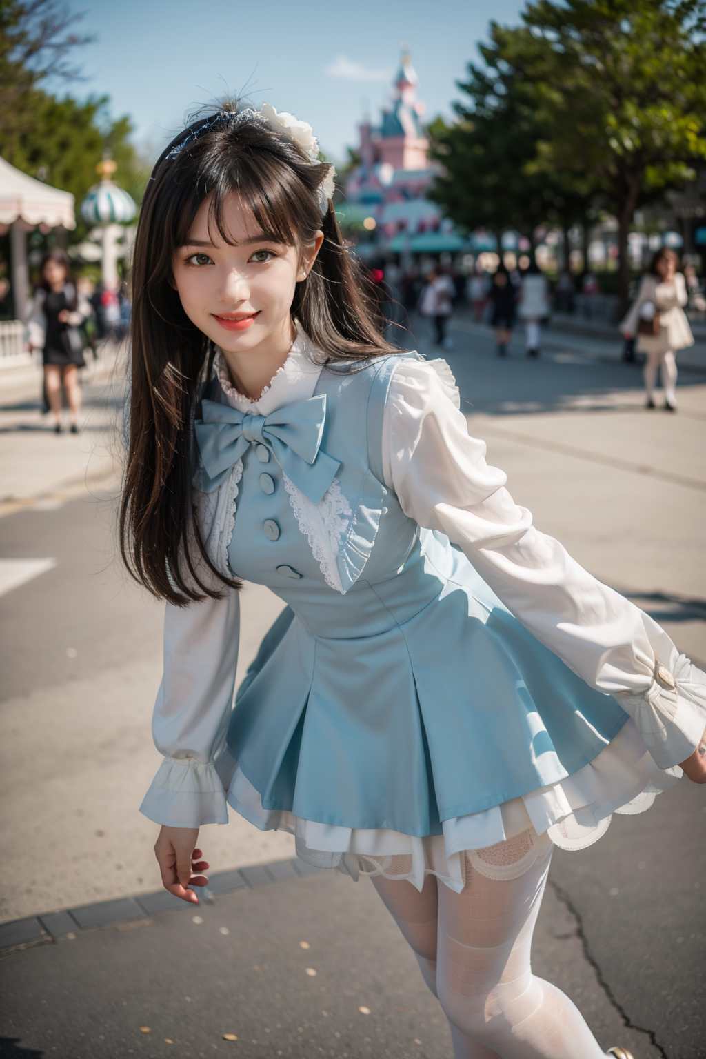 best quality, masterpiece, photorealistic, 1girl, solo, long straight black hair, blunt bangs, looking at viewer, full body, cyb dress, blue dress, long sleeves, puffy long sleeves, bow, (white pantyhose:1.4), mary janes, amusement park, people, <lora:cute_dress_style1_v1:0.7>