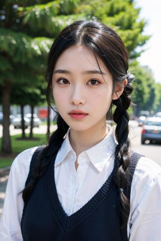 xxmixgirl, 1girl, solo, blurry background, black hair, outdoors, light on face, blurry, black eyes, upper body, lips, day, sky, realistic, blue sky, high school uniform, white shirt, long hair, brown sweater vest, twin braids,, closed mouth looking to the side, Zhenxin