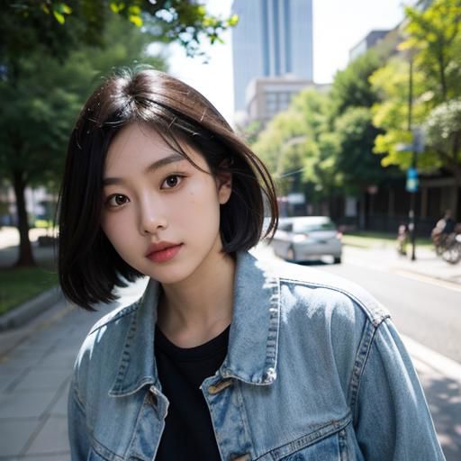 xxmixgirl, 1girl,chubby, solo, blurry background, black hair, outdoors, light on face, blurry, black eyes, upper body, lips, day, sky, realistic, blue sky, shirt, white shirt, short hair, jacket, closed mouth, looking to the side, Zhenxin
