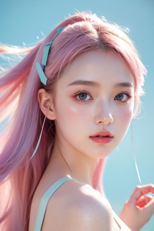 1girl,,Sweet,Kawaii,half body portrait,(8k, best quality, masterpiece:1.3),(best quality:1.0), (ultra highres:1.0), hair ribbons,watercolor, a beautiful woman, pastel colors, (Ink:1.1),high quality texture,Tiffany Blue background,, smoke, dimmed backlight, PEHighContrast, floating particles, dynamic Scene ,divine halo