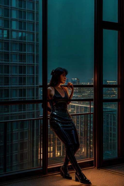 Imagine a night scene full of mystery and enchantment: an elegant and modern young woman, sitting gracefully in a cross-legged chair inside her cozy apartment. From the balcony, the silhouette of the girl can be seen, holding her cell phone out, while the brightness of the screen subtly illuminates her face. The balcony glass shows impressive reflections of the imposing buildings nearby, which are magically blurred by the dim light of the night. Cool tones dominate the color palette, creating an ethereal and mysterious atmosphere. The girl seems to be immersed in her world, oblivious to the urban beauty that surrounds her, while the city, framed by glass, by alex1shved