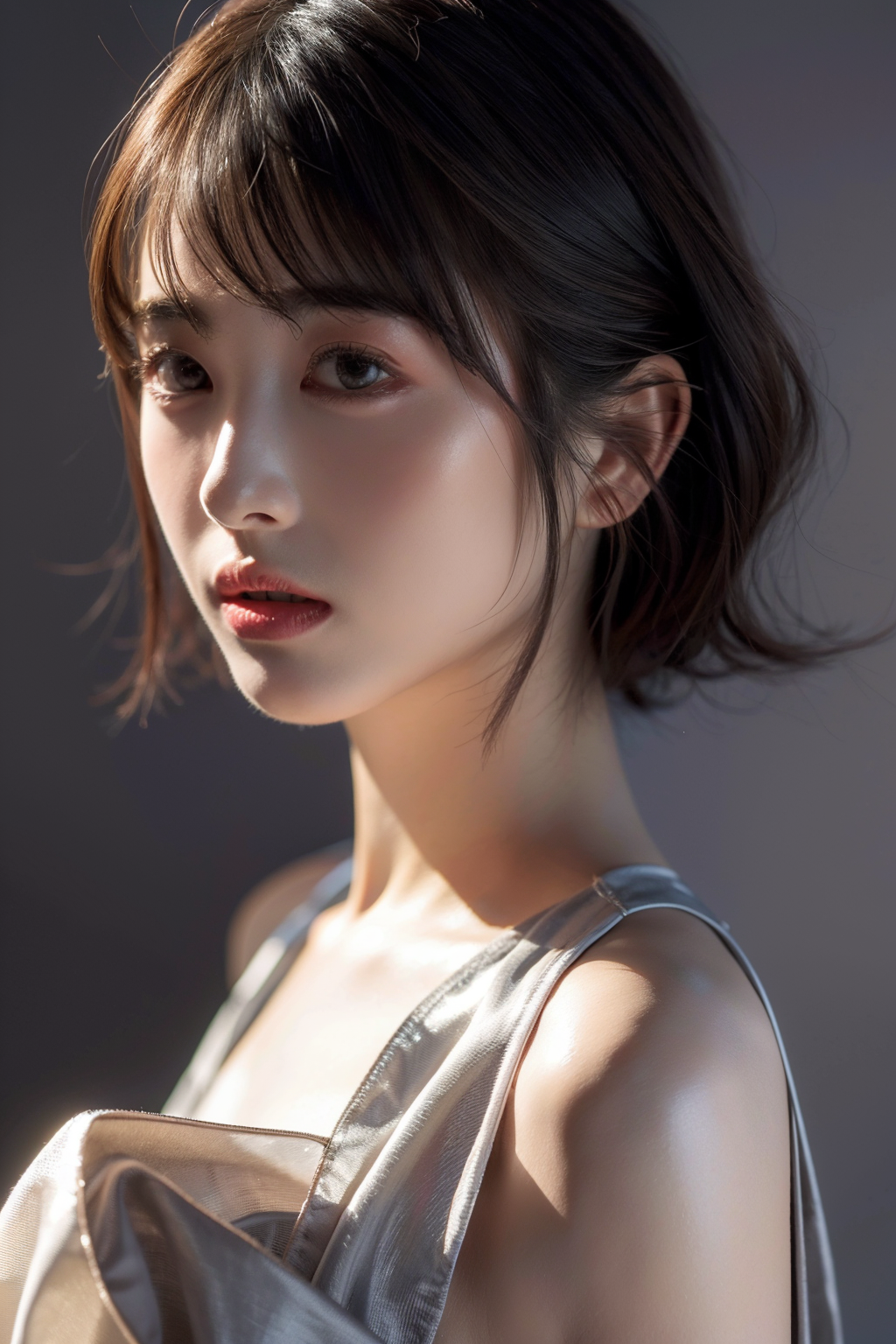 (realistic), (hyperrealism),best quality, masterpiece,ultra high res, (photorealistic:1.4),1girl, simple gray background, formal dress, looking at viewer, short hair, bangs, upper body,<lora:makina69_hamabeminami_v2.0:1> ,<lora:add_detail:0.6>