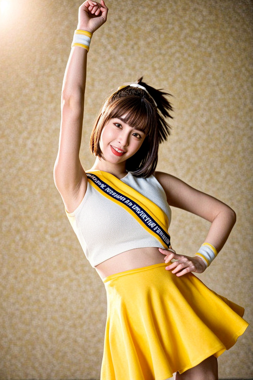 hyper realistic lifelike texture dramatic lighting unreal engine trending on art station, award winning photo, nikon RAW photo,8 k, Fujifilm XT3,masterpiece, best quality, realistic, photorealistic, ultra detailed, extremely detailed face, solo,1girl,(looking at viewer),smile,stadium,yellow cheerleader uniform, upper body,<lora:qun:0.9>,<lora:add_detail:0.3>,<lora:LCM-LoRA_sd15:1>