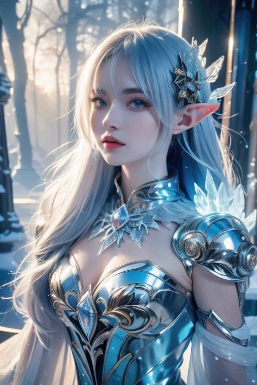 (Best quality, 4k, High-resolution, Masterpiece:1.2), Ultra-detailed, Realistic, Radiant lighting, Epoch Elves, Portraits, Fantastical colors, Fine art, Ethereal beings, Dreamlike, Whimsical creatures, detailed facial features, Glowing eyes, Elven beauties, Ethereal glow, Mythical creatures, Harmonious composition, Dazzling colors, Stunning visual effects, Otherworldly appearance, mesmerizing artistry. (best quality, highres, realistic:1.37), detailed icy landscape, mystical creatures, sparkling snowflakes, ethereal beauty, magical lighting, enchanting atmosphere, intricate ice formations, frost-covered trees, shimmering icicles, delicate snowfall, frozen wonderland, serene silence, captivating winter scene, subtle shades of blue, glistening frost, frozen stillness, otherworldly charm.