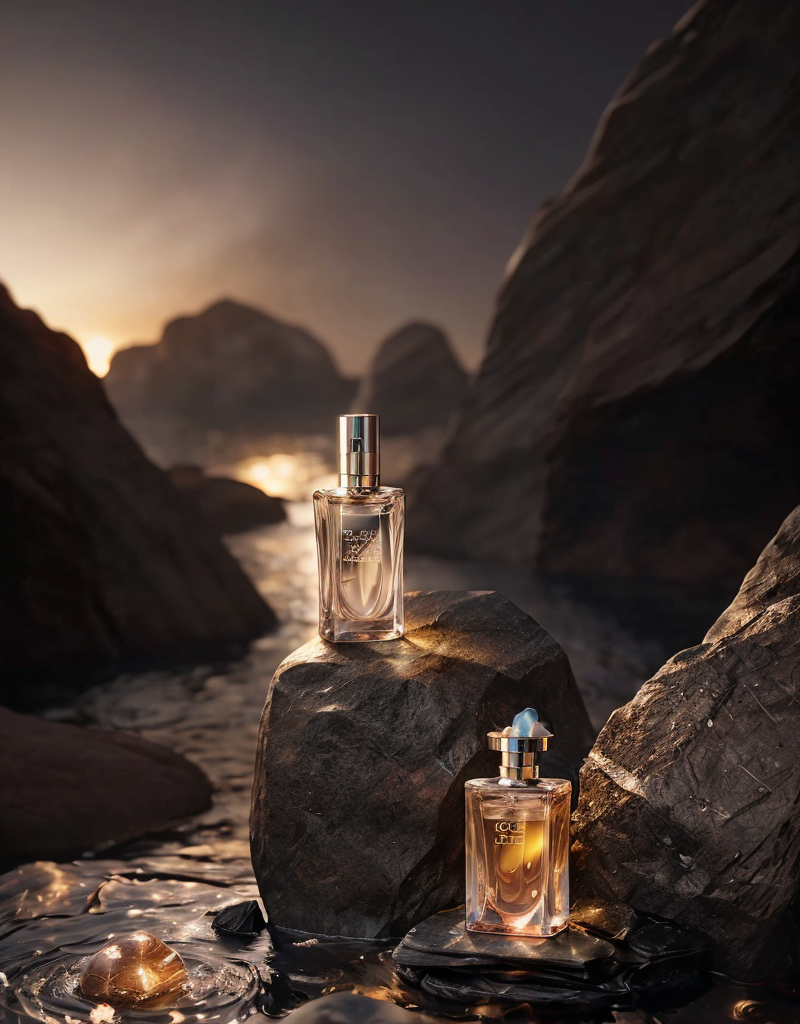 anse,Men's perfume, rocks, water, bright light,octane render, unreal engine, film grain, bokeh, blur foreground, blur background,gradient background,blur