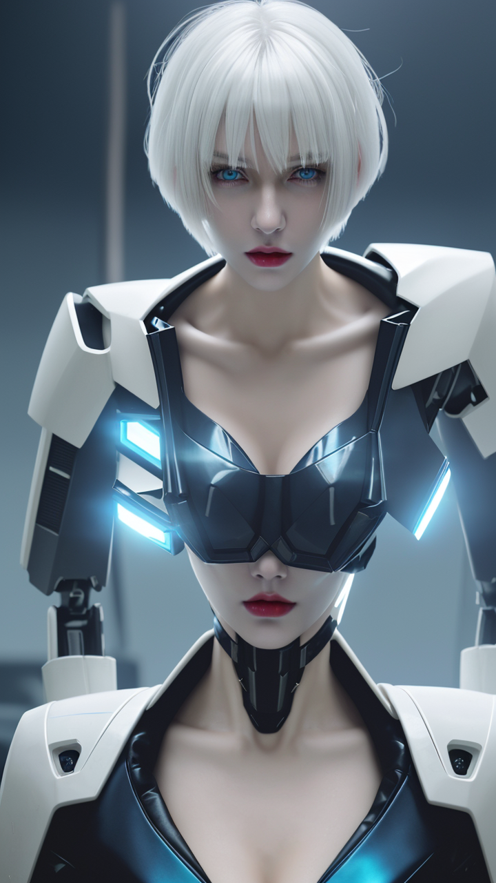 1girl, bangs, white hair, blue eyes, fashi-girl,bob cut,short hair, cleavage, collarbone, open jacket,mecha,cyberpunk,neon lights,large breasts,mature female,shiny skin,rain,water drop,badass,alluring,mecha musume,ghost in the shell,red lips,looking to the side,closed mouth,headphones,cinematic lighting <lora:fashion girl:1>