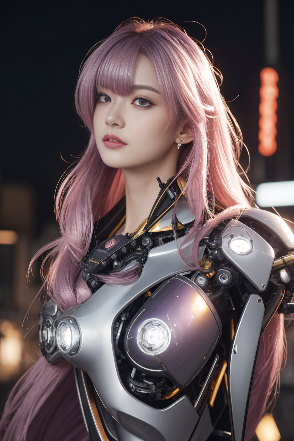 <dhevv:at-style:g>,gold,masterpiece, best quality, illustration, beautiful detailed eyes, colorful background, mechanical prosthesis, mecha coverage, fluorescent purple, cool movement, rose red eyes, beatiful detailed cyberpunk city,pink siver hair, beautiful detailed glow, 1 girl, expressionless, cold expression, insanity, long bangs, long hair, lace, dynamic composition, motion, ultra - detailed, incredibly detailed, a lot of details, amazing fine details and brush strokes, smooth,
