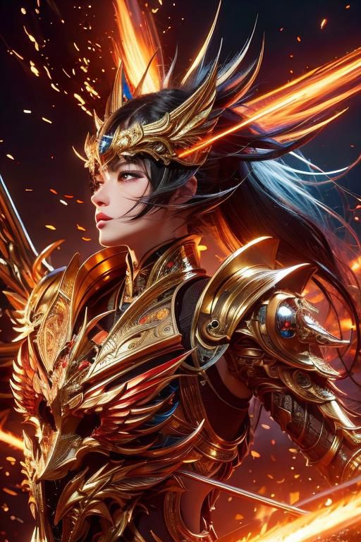 action shot,photorealistic, detailed flying hair, urbanpunk, more colorful, , seductive woman fighting at war, posing , body is adorned with glowing golden runes, wearing light gundam black and red armor, short white hair is blowing in the wind, fighting at war, raging, trending on artstation, extreme details, cinematic, shiny, surreal, divine, celestial, manga, anime, intricate details, very detailed and intricate armor, octane render, dynamic epic action pose, dynamic angle,