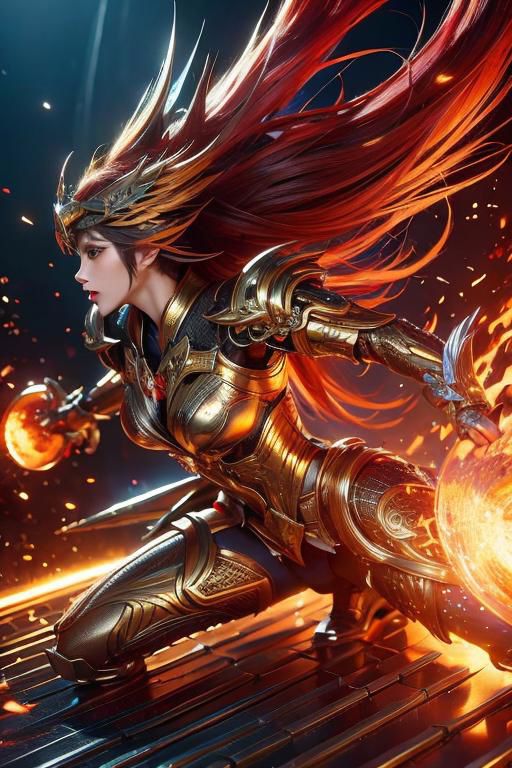 action shot,photorealistic, detailed flying hair, urbanpunk, more colorful, , seductive woman fighting at war, posing , body is adorned with glowing golden runes, wearing light gundam black and red armor, short white hair is blowing in the wind, fighting at war, raging, trending on artstation, extreme details, cinematic, shiny, surreal, divine, celestial, manga, anime, intricate details, very detailed and intricate armor, octane render, dynamic epic action pose, dynamic angle,