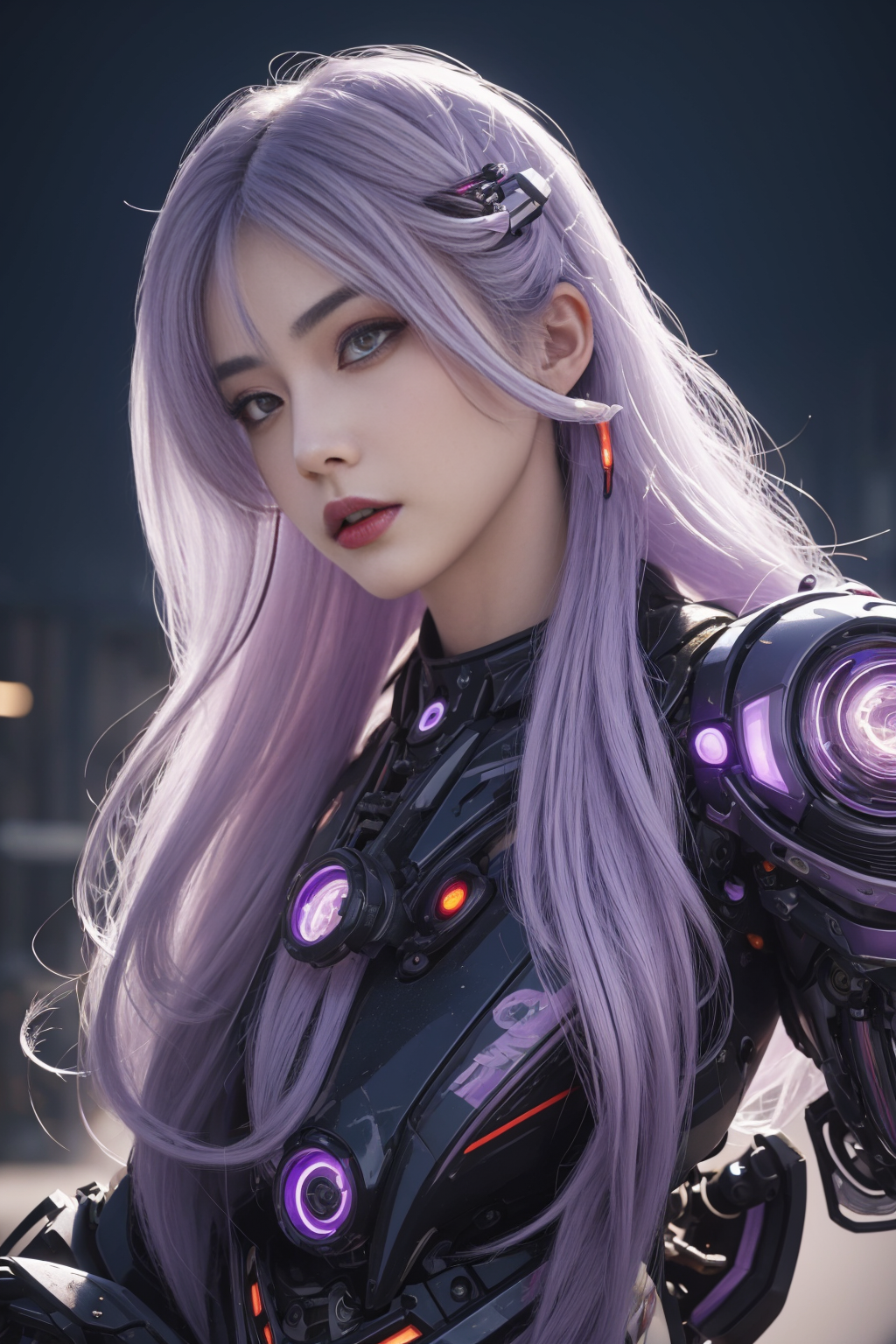 <dhevv:f-style:f1>,masterpiece, best quality, illustration, beautiful detailed eyes, colorful background, mechanical prosthesis, emerging dark purple across with white hair, disheveled hair, fluorescent purple, cool movement, rose red eyes, beatiful detailed cyberpunk city, multicolored hair, beautiful detailed glow, 1 girl, expressionless, cold expression, insanity, long bangs, long hair, lace, dynamic composition, motion, ultra - detailed, incredibly detailed, a lot of details, amazing fine details and brush strokes, smooth,