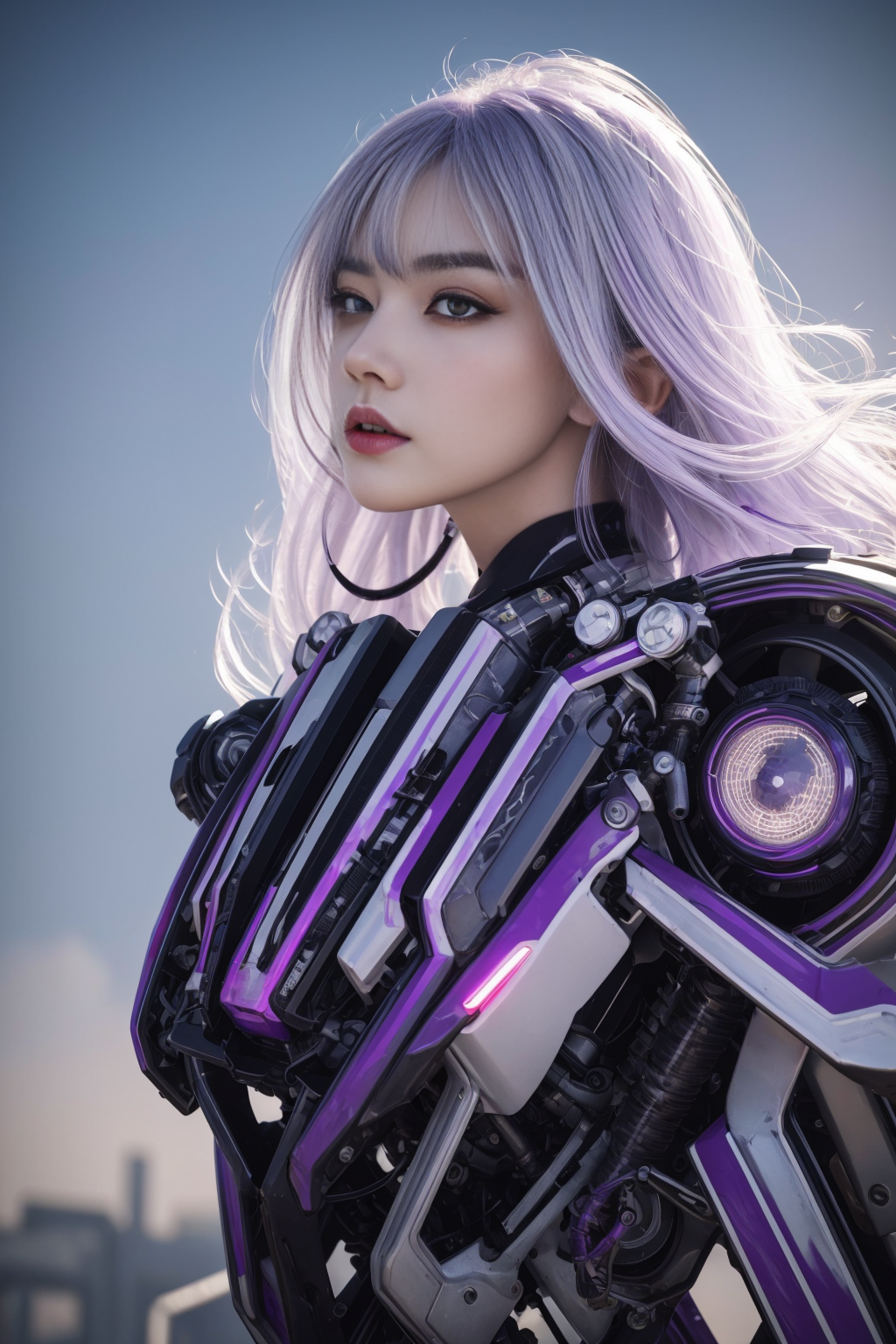<dhevv:f-style:f1>,masterpiece, best quality, illustration, beautiful detailed eyes, colorful background, mechanical prosthesis, emerging dark purple across with white hair, disheveled hair, fluorescent purple, cool movement, rose red eyes, beatiful detailed cyberpunk city, multicolored hair, beautiful detailed glow, 1 girl, expressionless, cold expression, insanity, long bangs, long hair, lace, dynamic composition, motion, ultra - detailed, incredibly detailed, a lot of details, amazing fine details and brush strokes, smooth,