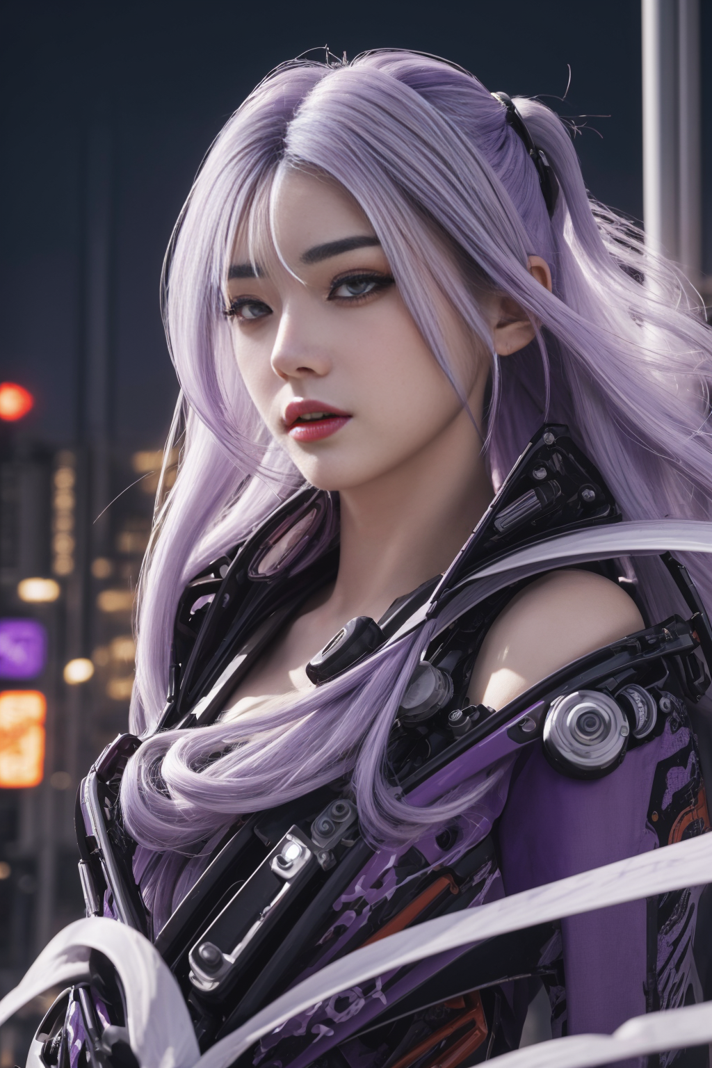 <dhevv:f-style:f1>,masterpiece, best quality, illustration, beautiful detailed eyes, colorful background, mechanical prosthesis, emerging dark purple across with white hair, disheveled hair, fluorescent purple, cool movement, rose red eyes, beatiful detailed cyberpunk city, multicolored hair, beautiful detailed glow, 1 girl, expressionless, cold expression, insanity, long bangs, long hair, lace, dynamic composition, motion, ultra - detailed, incredibly detailed, a lot of details, amazing fine details and brush strokes, smooth,