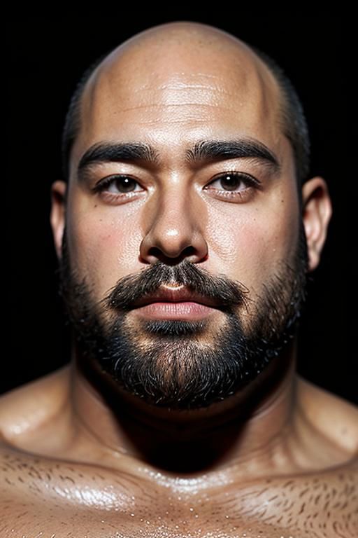 face close up, glamour photography of a random stylish chubby, men, bearded, bald, beefy, shiny skin, grainy, harsh flash lighting, sepia tone