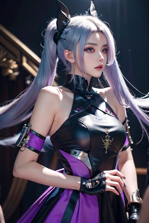 masterpiece, best quality, illustration, beautiful detailed eyes, colorful background, mechanical prosthesis, mecha coverage, emerging dark purple across with white hair, pig tails, disheveled hair, fluorescent purple, cool movement, rose red eyes, beatiful detailed cyberpunk city, multicolored hair, beautiful detailed glow, 1 girl, expressionless, cold expression, insanity, long bangs, long hair, lace, dynamic composition, motion, ultra - detailed, incredibly detailed, a lot of details, amazing fine details and brush strokes, smooth, hd semirealistic anime cg concept art digital painting, cyborg style,