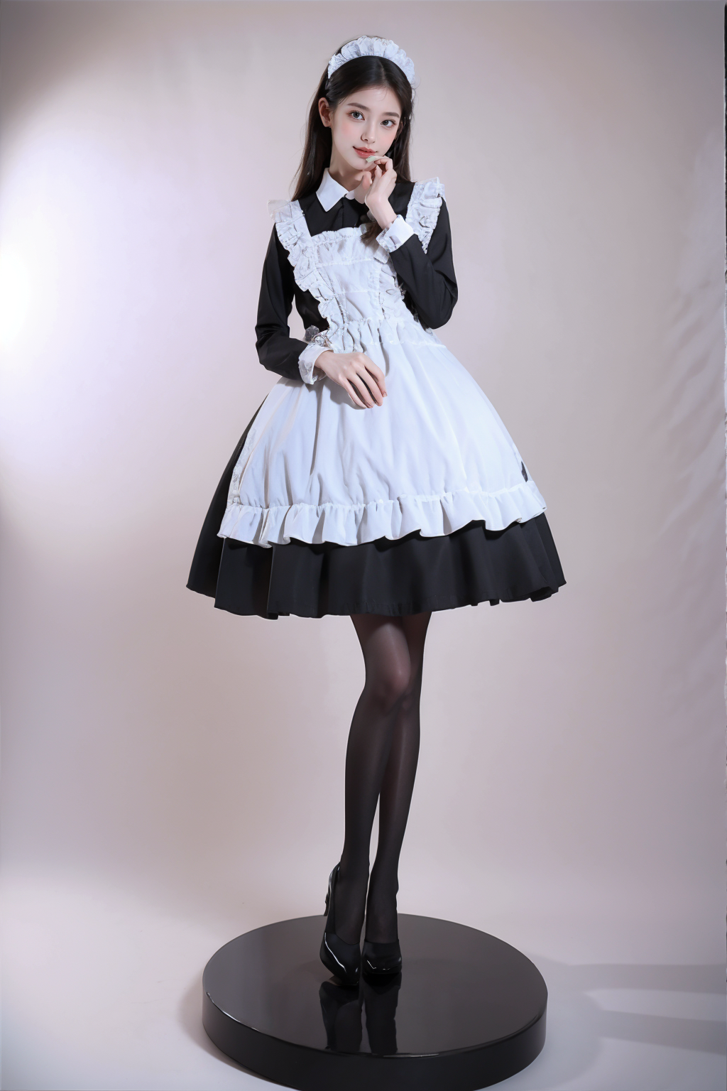 masterpiece,best quality,high quality,simple_background,perfect anatomy, (full body:1.3),standing,1girl,solo,looking at viewer,(standing on top of items:1.5),(platform:1.5),display,(spread legs:1.5),black hair,long hair,<lora:è¡£æç¹å«çå°å¥³æè§:0.4>,<lora:æ¸ -000006:0.8>,(high_heels:1.5),traditional maid ,<lora:è¡£æä¼ ç»å¥³ä»ç¤¼æ:0.8>,