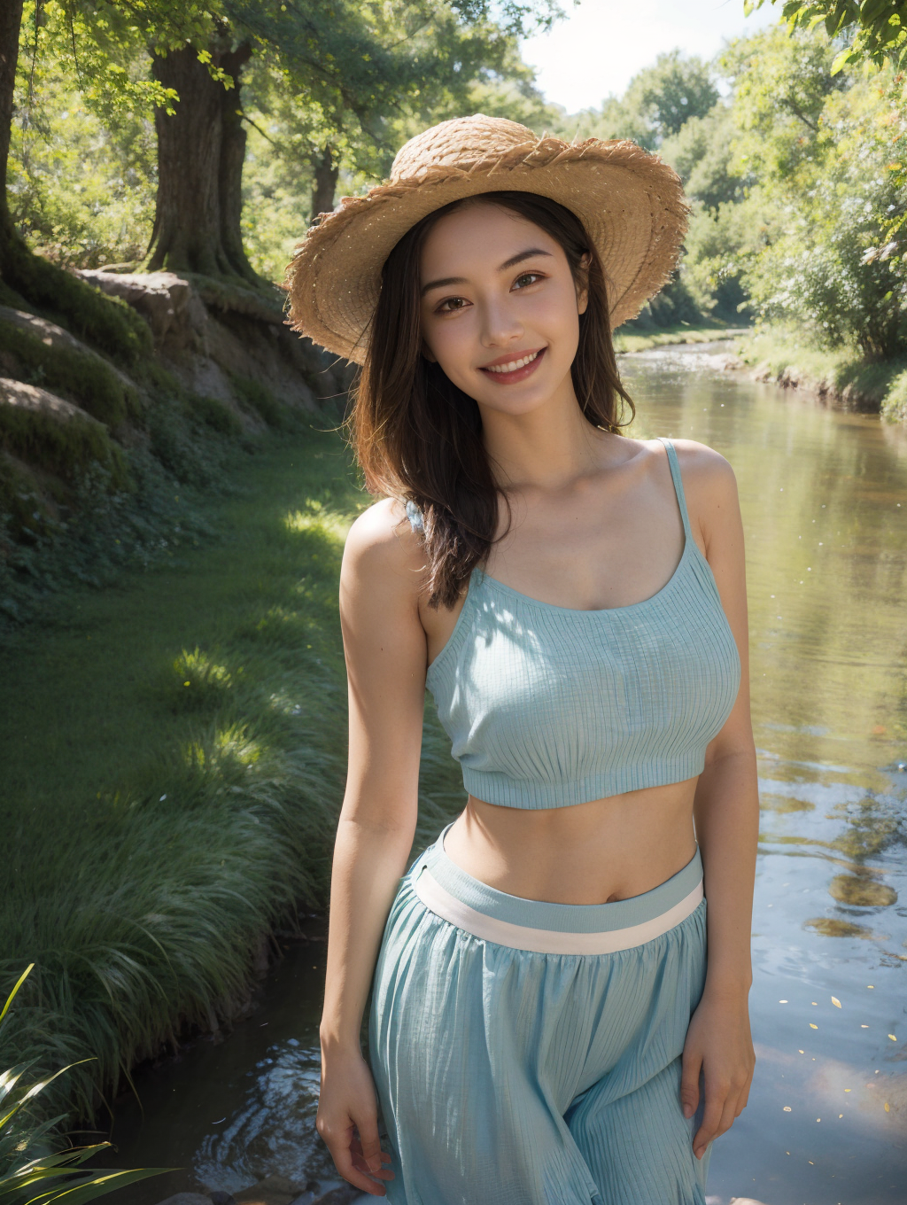 1girl,straw hat,cowboy shot,grass skirt,lazy,elegant,curvy,flower,blue sky,dappled sunlight, <lora:slg_v30:0.4>,slg,grass,path,river,waterfall,forest,upper_body,(grin:0.8),