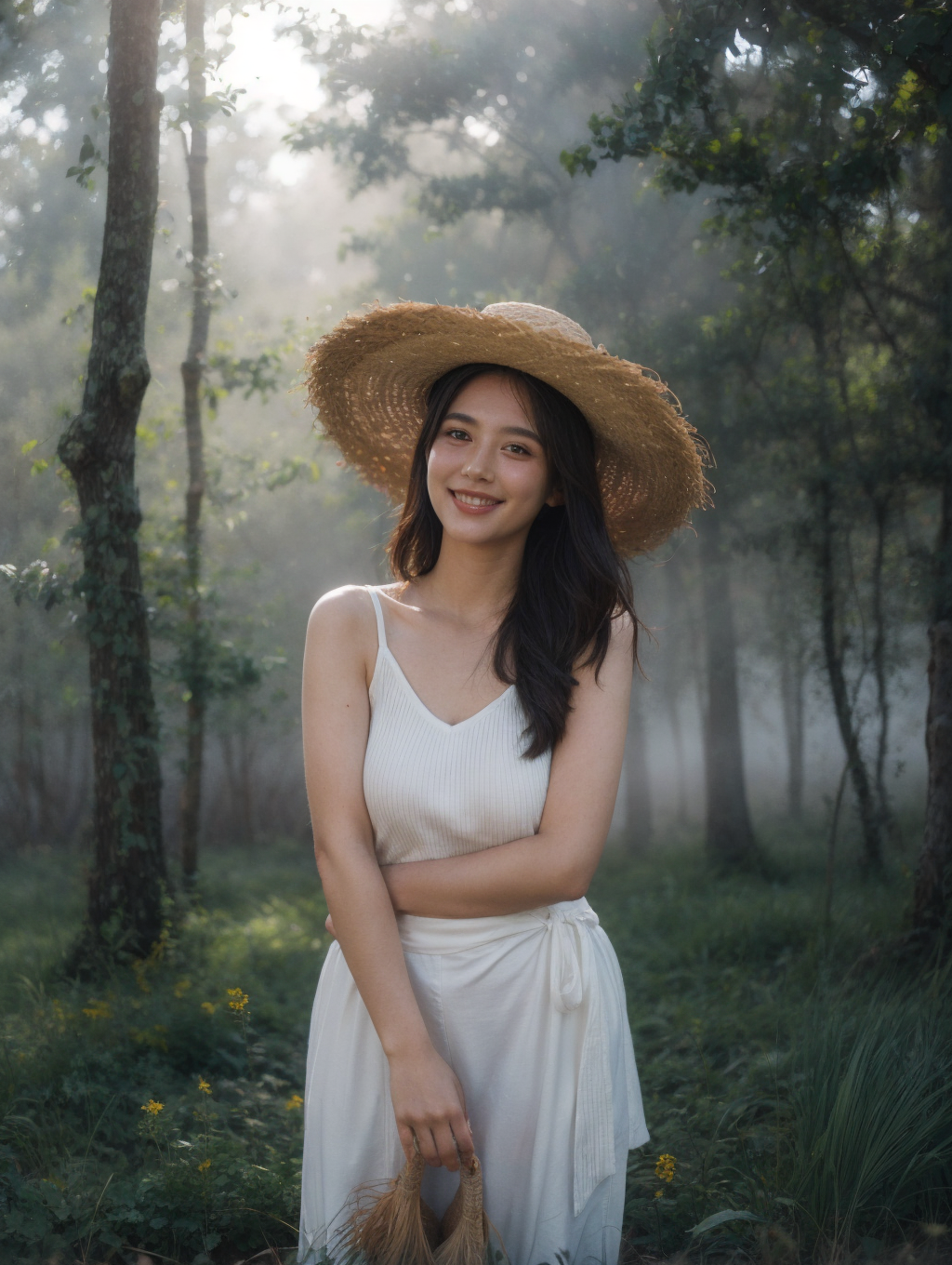 1girl,straw hat,cowboy shot,grass skirt,cowboy shot,lazy,elegant,curvy,flower,blue sky,dappled sunlight,((Fog and Mist)),(((Tyndall effect))),solo_focus,close-up, <lora:slg_v30:0.4>,slg,((forest)),midwood,(grin:0.6),<lora:FilmVelvia3:0.4>,<lora:lowra_v10:0.4>,<lora:add_detail:0.4>,<lora:epi_noiseoffset2:0.4>,