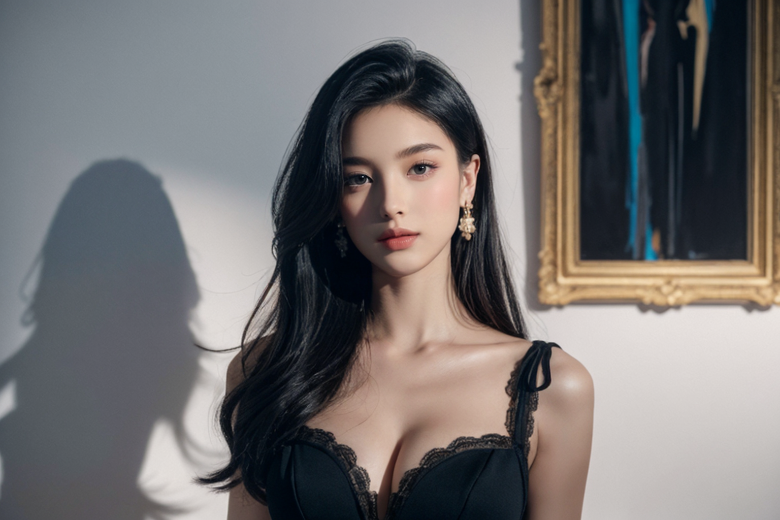 (best quality, masterpiece), (photorealistic:1.4), raw photo, ultra high res, professional, (dark shot, best shadow:1.4), absurdres, ultra detailed, extremely detailed, intricately detailed, HDR, UHD, 64K, 1girl, Beaming, Exuberant, extremely delicate and beautiful face, perfect eyes, intricately detailed beautiful eyes, deep story-like eyes, eye contact, elegance, stylish, intricately detailed skin, perfect anatomy, Biting her lower lip gently, in a mix of excitement and anticipation, glamorous dress, contemporary design, sophisticated lines, by Donatella Versace and Alexander McQueen, bold color palette, stands at the center, confident pose, (Modern art gallery:1.4), a lot of modern art painting, abstract art background, artistic atmosphere, classic British fashion, close up, dynamic angle, Steadicam Shot, natural light, LUT-adjusted vintage cinematic colors and textures, highlighted features, cinematic mood, film grain, lifelike, taken by Henri Cartier-Bresson and Helmut Newton, <lora:FilmVelvia3:0.2>, <lora:LowRA:0.3>, <lora:add_detail:0.5>,