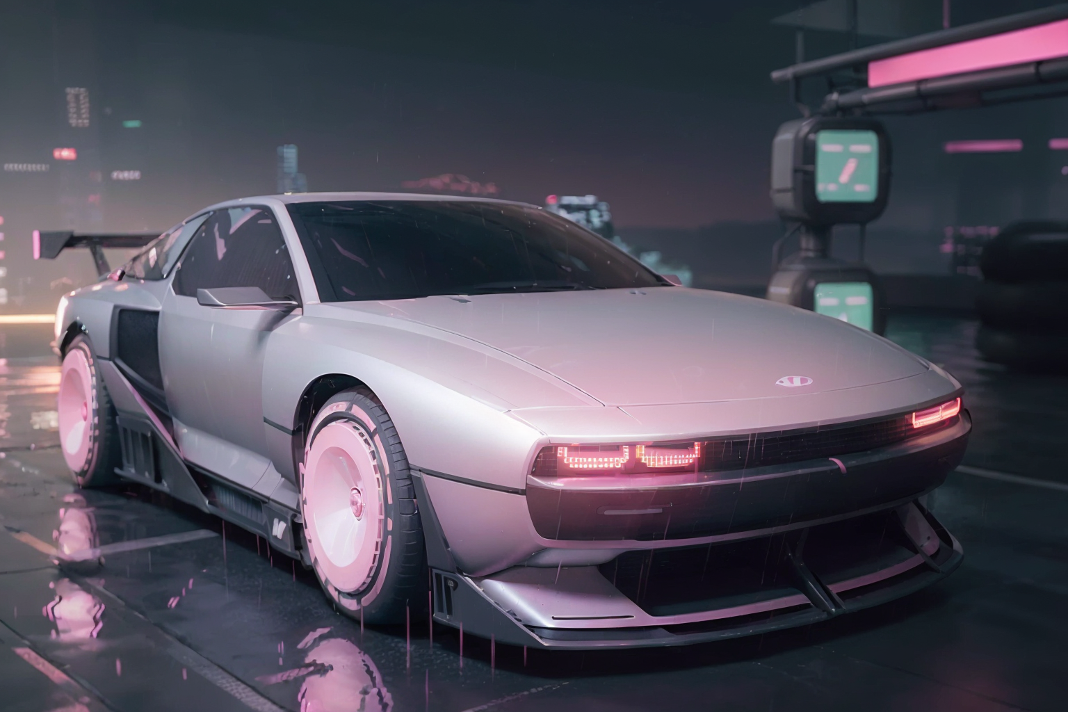 ((masterpiece,best quality)), nv74 car, with (concept rims), no humans, driving cyberpunk city, through the rain, moving, (motion blur:0.6), (speed effect:0.6), ultra-detailed, 8k, highres, cinematic, <lora:nv74:1>, (<lora:FutureCity_last:1.2>, korean neon sign:1.1), a lonely atmosphere, purple background, heavy rain, night, (cyberpunk:1.3), skyscraper, (midnight, cyberfunk background, retrowave light, pink pattern:1.3)