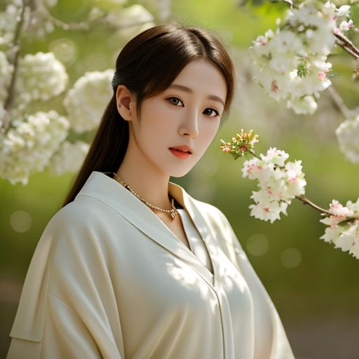 dynamic pose, foliage with Birch tree, girl, japanese, wearing Alabaster Jodhpurs with Polyester images, Snug Necklace, Ultrarealistic, Amusing, American Impressionism, spotlit, high detailed, high detailed face, detailed eyes, high quality face,