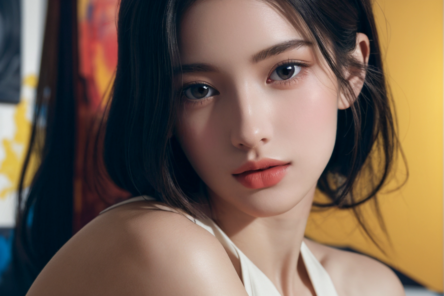(best quality, masterpiece), (photorealistic:1.4), raw photo, ultra high res, professional, (dark shot, best shadow:1.4), absurdres, ultra detailed, extremely detailed, intricately detailed, HDR, UHD, 64K, 1girl, Alluring, Delightful, extremely delicate and beautiful face, perfect eyes, intricately detailed beautiful eyes, deep story-like eyes, looking through legs, elegance, stylish, intricately detailed skin, perfect anatomy, Holding onto gifts or keepsakes, like a ring or bracelet, given by her partner, glamorous dress, contemporary design, sophisticated lines, by Victoria Caroline Beckham and Virgil Abloh, bold color palette, stands at the center, confident pose, (Modern art gallery:1.4), a lot of modern art painting, abstract art background, artistic atmosphere, classic British fashion, close up, dynamic angle, High Angle, natural light, LUT-adjusted vintage cinematic colors and textures, highlighted features, cinematic mood, film grain, lifelike, taken by August Sander and Alfred Stieglitz, <lora:FilmVelvia3:0.2>, <lora:LowRA:0.3>, <lora:add_detail:0.5>,