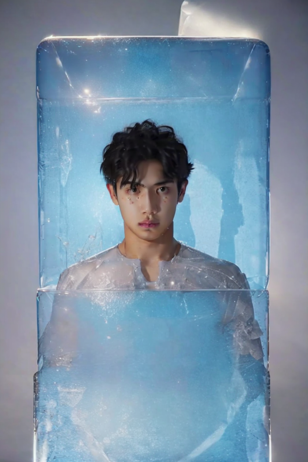 1 boy frozen in a ice block,<lora:frozen_squirrel_v3_64:0.8>,