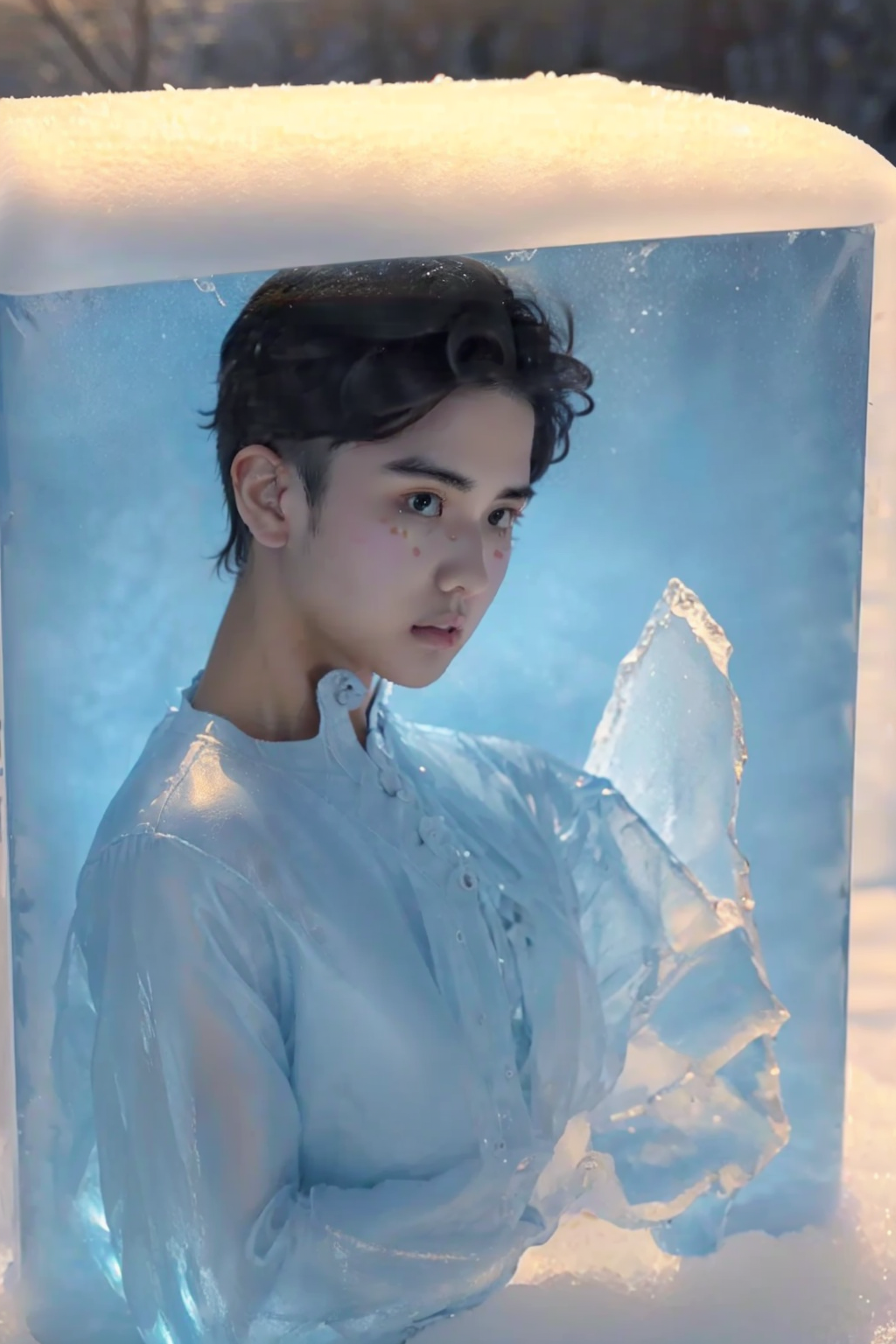1 boy frozen in a ice block,<lora:frozen_squirrel_v3_64:0.7>,front view,upper body,