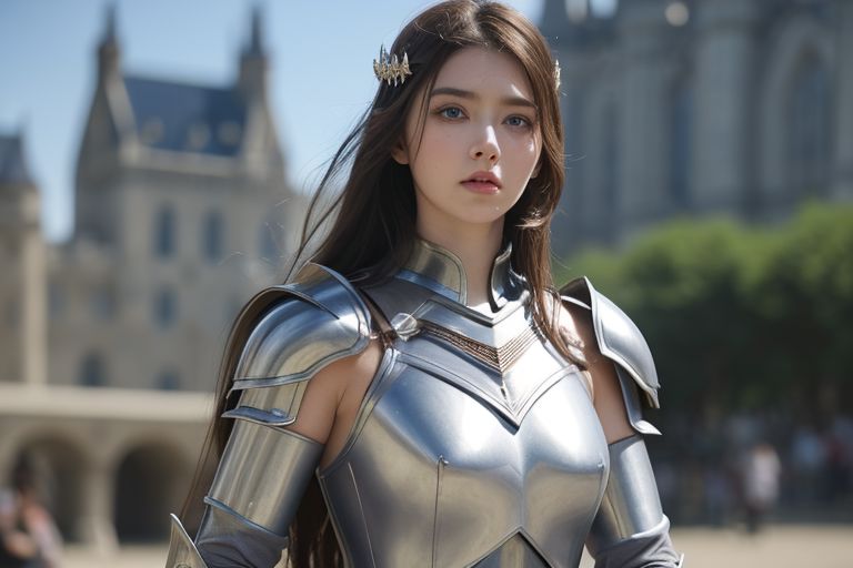 1girl, armor, blue eyes, blurry, blurry background, blurry foreground, breastplate, breasts, brown hair, depth of field, hair piece ornament, long hair, looking at viewer, motion blur, shoulder armor, solo, standing, upper body, weapon, castle background, war action