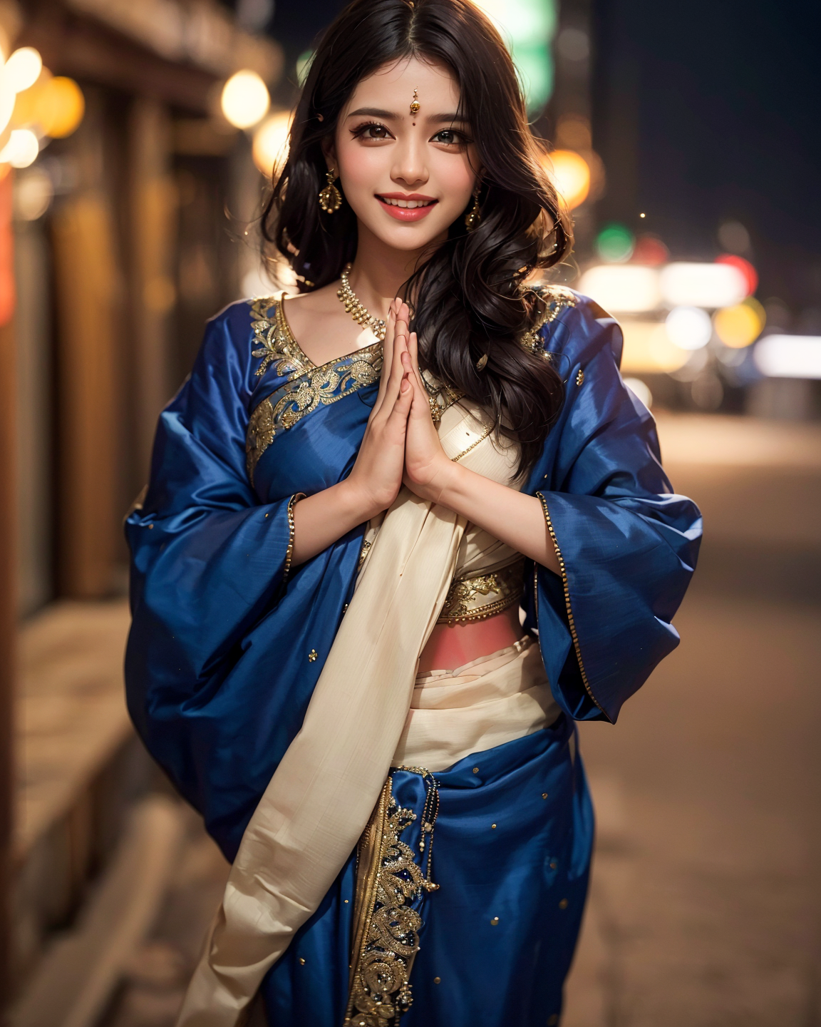 stunningly beautiful, open hair, wolfcut hairbangs, perfect face , wearing Kanjivaram Saree, joining hands as a greeting, cute smile, intricate details, ultra-realistic, night time, light bokeh in background, high saturation, cinematic light, 35mm raw photo,