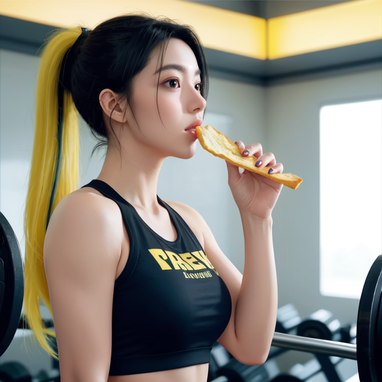 cinematic, wide shot, upper body, an exquisitely beautiful idol woman professional wrestler is eating.a snack at a training gym, (beautiful slim face) (black hair based yellow colored inner hair), front ponytail, stocky body with some fat, (OverallDetail:0.46)
