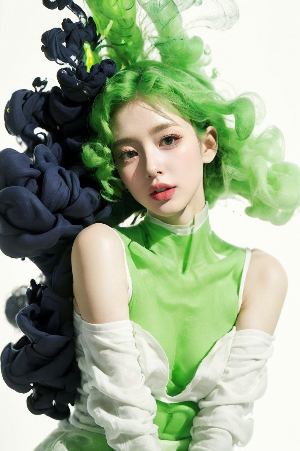 (1girl:1.2),stars in the eyes,smoke surrounds the girl,white clothes,(full_shot:1.2),(light green theme:1.2),(pure girl:1.1),curly hair,short hair,(black_background:1.2),(full_shot:1.1),depth of field,adhesion,<lora:smoke_20231011231151-000007:0.8>,smoke,