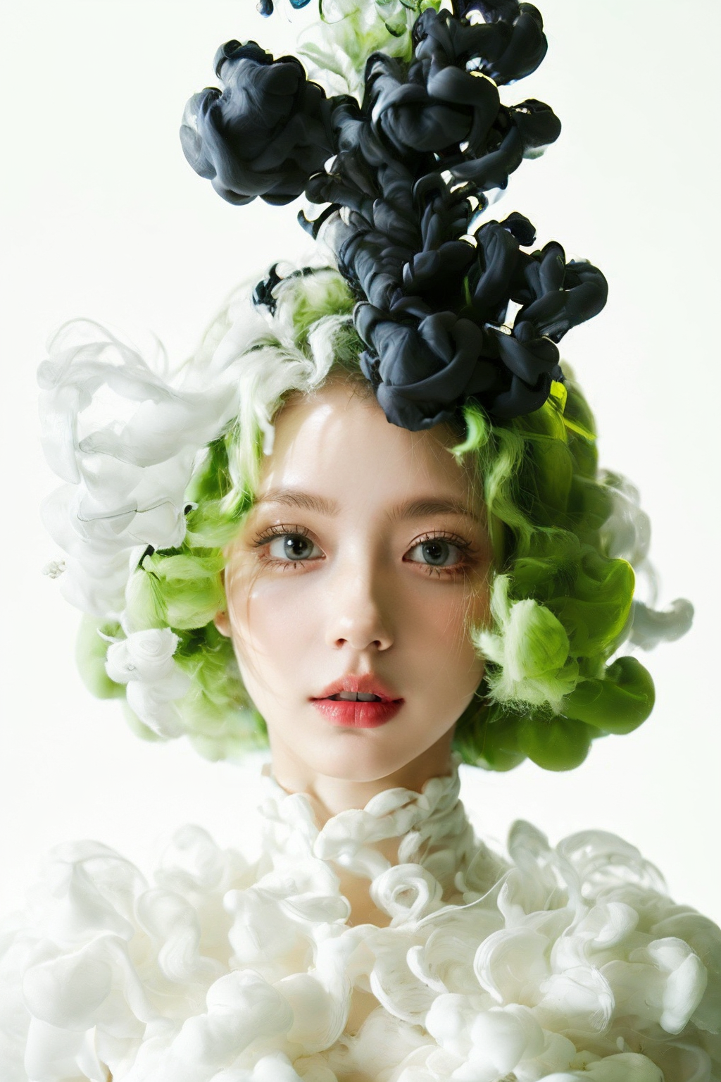 (1girl:1.2),stars in the eyes,smoke surrounds the girl,white clothes,(full_shot:1.2),(light green theme:1.2),(pure girl:1.1),curly hair,short hair,(black_background:1.2),(full_shot:1.1),depth of field,adhesion,<lora:smoke_20231011231151-000007:0.8>,smoke,