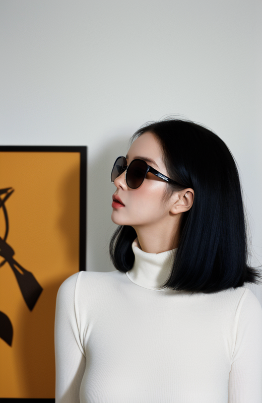 huge filesize,absurdres,detailed,(vibrant, sharp focus, 8k),front profile half body Photography,in front of black wall,a punk 80's British model woman with 50's haircut,in a white turtleneck dress and large sunglasses,art by Sergio Lopez,Natalie Shau,james jean and salvador dali,