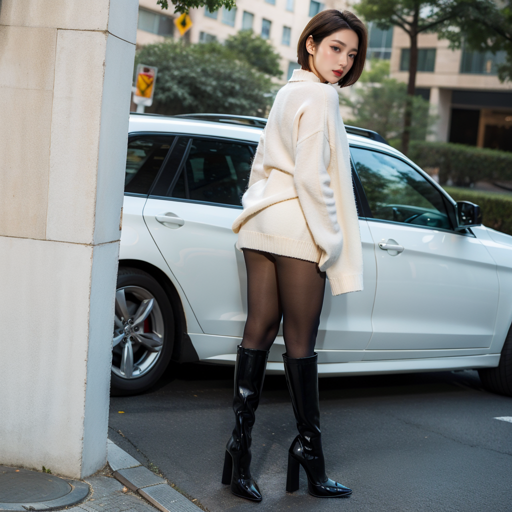black color RealPantyhose,best quality,((((masterpiece)))),((((highly detailed)))),[[[realistic art]]],((full body)),wide shot,ultra highres,makeup,fundoshi,eyeshadow,long_eyelashes,red_lips_,1girl,. 35mm photograph,film,bokeh,professional,4k,highly detailed,<lora:RealPantyhose_1_0:0.8>,seductive posture,intimate actions,high heel boots,short hair,white sweater,plaid skirt,<lora:kdlegver-000008:0.5>,