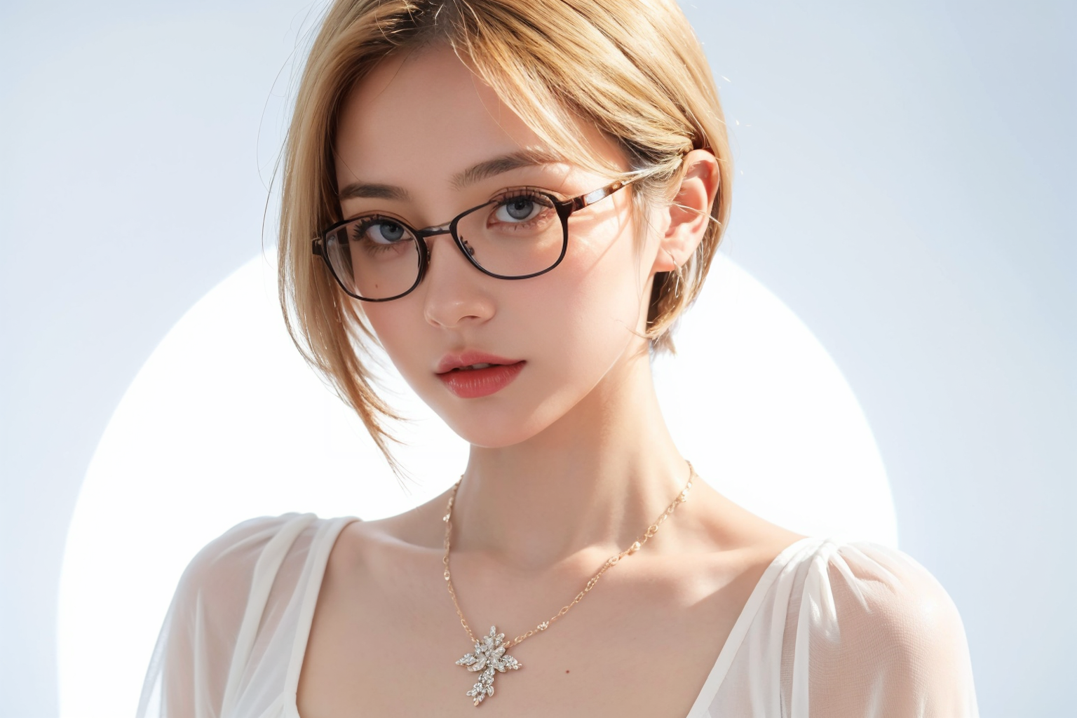 Best quality, ultra-detailed, 8k resolution, (photorealistic:1.5), RAW, deep shsadow, very detailed hair, perfect finger, good hand, cowboys shot, standing:1.2 (1girl , greek goddes, rich, busty, blonde, short hair, glasses), blush, delicate skin, shiny skin, intense gaze, necklace studio background, white background, empty <lora:cute tiktok girl mix_V30.2> <lora:MengX girl_Mix_V40:0.2>