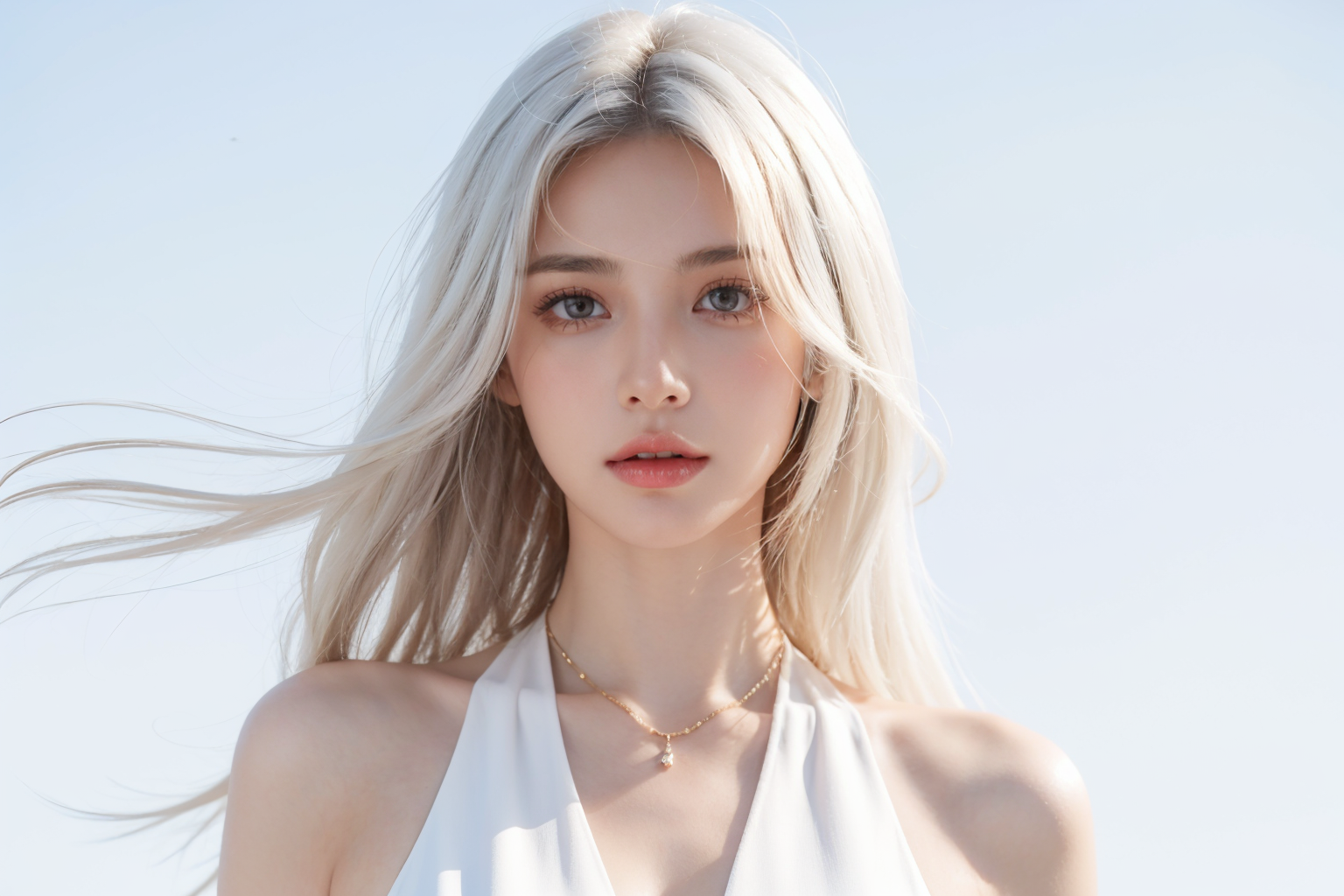 Best quality, ultra-detailed, 8k resolution, (photorealistic:1.5), RAW, deep shsadow, very detailed hair, perfect finger, good hand, cowboys shot, standing:1.2 (1girl , greek goddes, rich, busty, white hair, blown up hair), blush, delicate skin, shiny skin, intense gaze, necklace studio background, white background, empty <lora:cute tiktok girl mix_V30.2> <lora:MengX girl_Mix_V40:0.2>