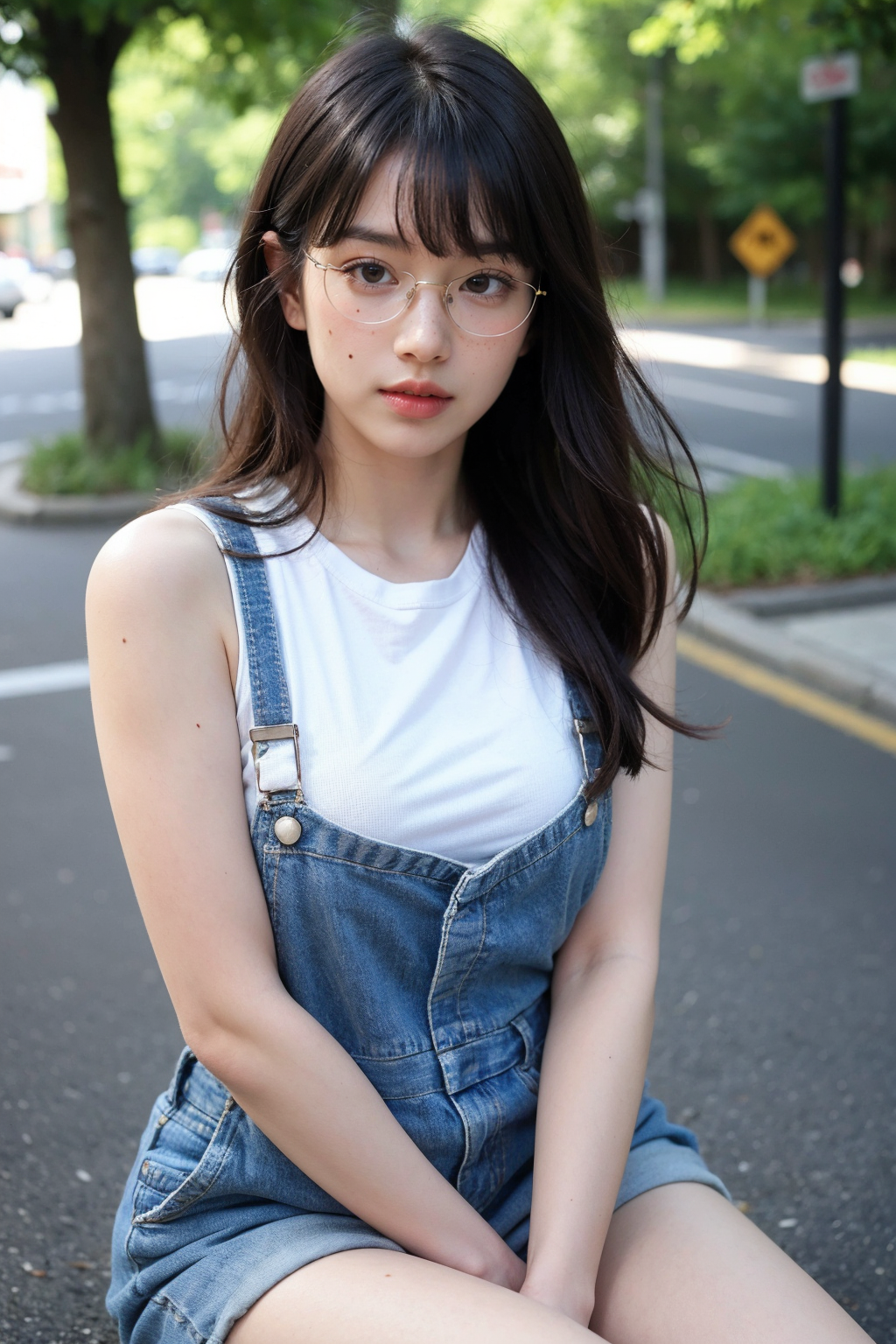 (masterpiece, hi res, absurd res, best quality, 4k, 8k, beautiful and aesthetic), 1girl, overalls, blunt bangs, wavy hair, messy hair, glasses, freckles, embarrassed, blush, sitting, arms between legs, outdoors,