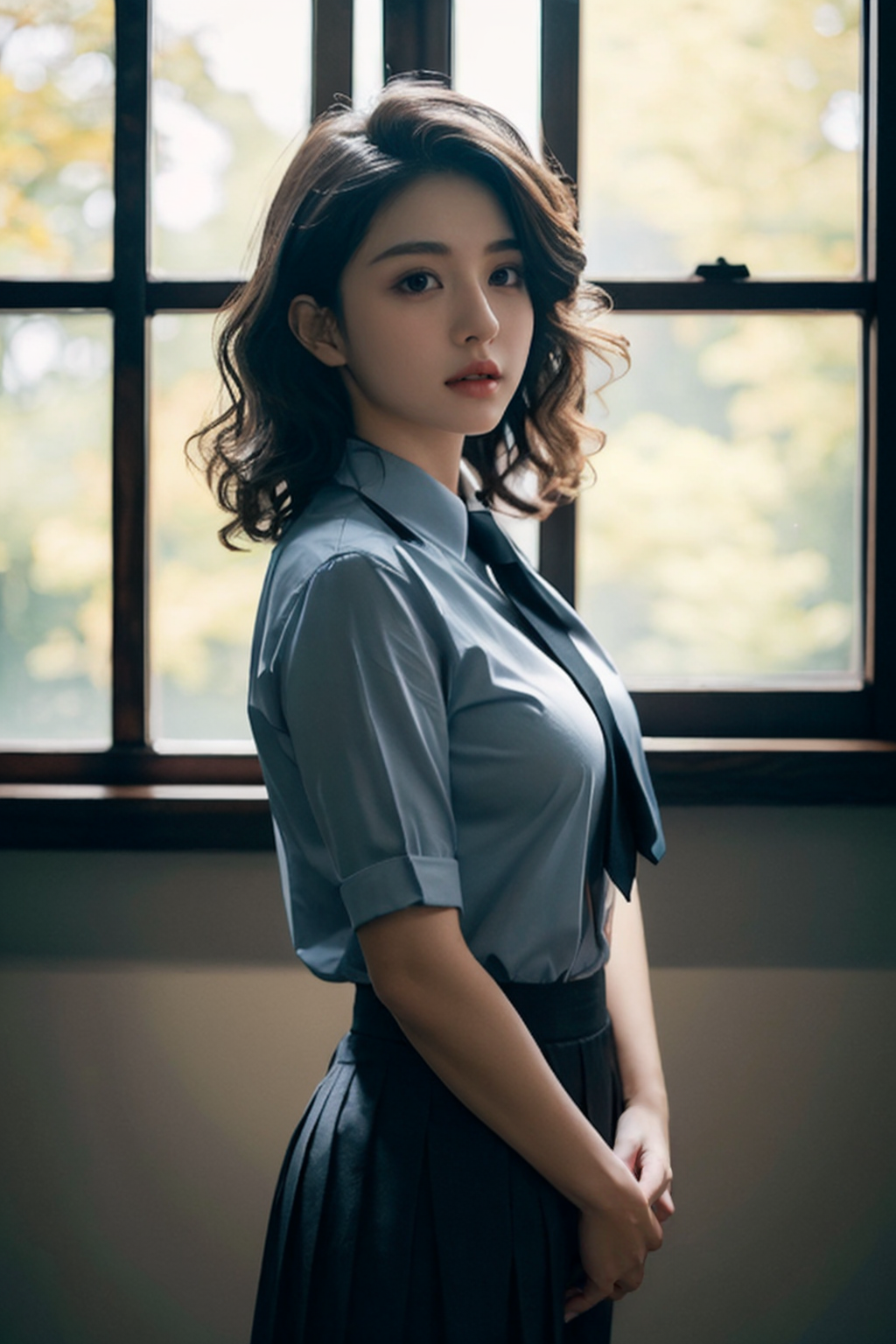 (best quality, masterpiece), ultra high res, (photorealistic:1.4), raw photo, insanely detailed, 1girl, beautiful, like a k-pop idol, Voluminous curls, Aging gracefully, Plump, Greek, Hazel eyes, Pointed Chin, Round Jaw, Broad Forehead, Heart face shape, , Grey Wavy haircut hair, Nervousness, looking at viewer, (pleated black necktie1.2), collared shirt, pleated skirt, best shadow, intricate, medium breasts, Arms linked with someone, indicating companionship (low key, dark scene, dimly lit:1.3), (soft window natural lighting:1.4), autumn, forest, middle shot, dynamic angle, golden ratio, film grain, Heavy grain, <lora:Heavy_grain:0.2>, <lora:LowRA:0.2>,