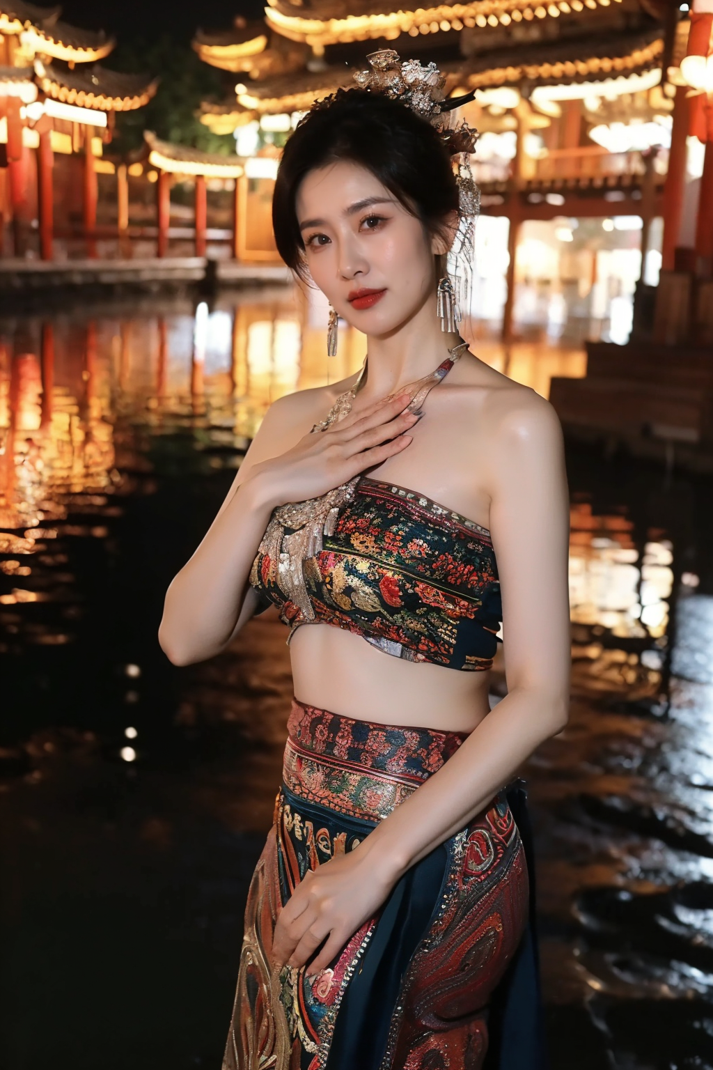 milf_saga, (8k, (RAW photo:1.2), (photorealistic:1.3), realistic, photorealistic, best quality, absurdres, ultra high res, masterpiece, chromatic aberration:1.1)), nsfw, (looking at viewer:1.21), (1girl), (bun, hair bun), eye focus, thighs, navel, town, outdoors, chinese style architecture, hair ornament, bare shoulders, jewelry, earrings <lora:miaoLujian:0.9> <lora:milfsaga_v4-000006:0.9:lbw=MILFA>