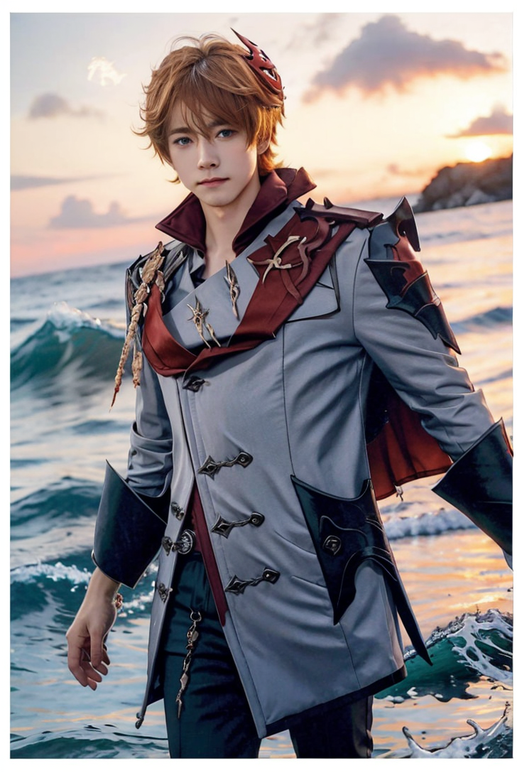male, blue eyes, orange hair <lora:childe-10:0.9>, fatui mask, mask on the side of the head, delusion, looking at the camera, smirk, battle ready, winter fur-coat over the shoulder, standing in the endless ocean, water particles in the background, Snezhnaya Delusion, high tide, abyss, tsunami, masterpiece, best quality, man, 1guy gloves crossed bangs, delusion (genshin impact), gloves, grey jacket, male focus, solo, full body, black gloves,upper body, strong physique, focused expression, high quality, boy, confident, high detail, red cape, solo, upper body, realistic,(shiny skin),fur trim, gloves, fur-trimmed coat, coat, visible delusion, male