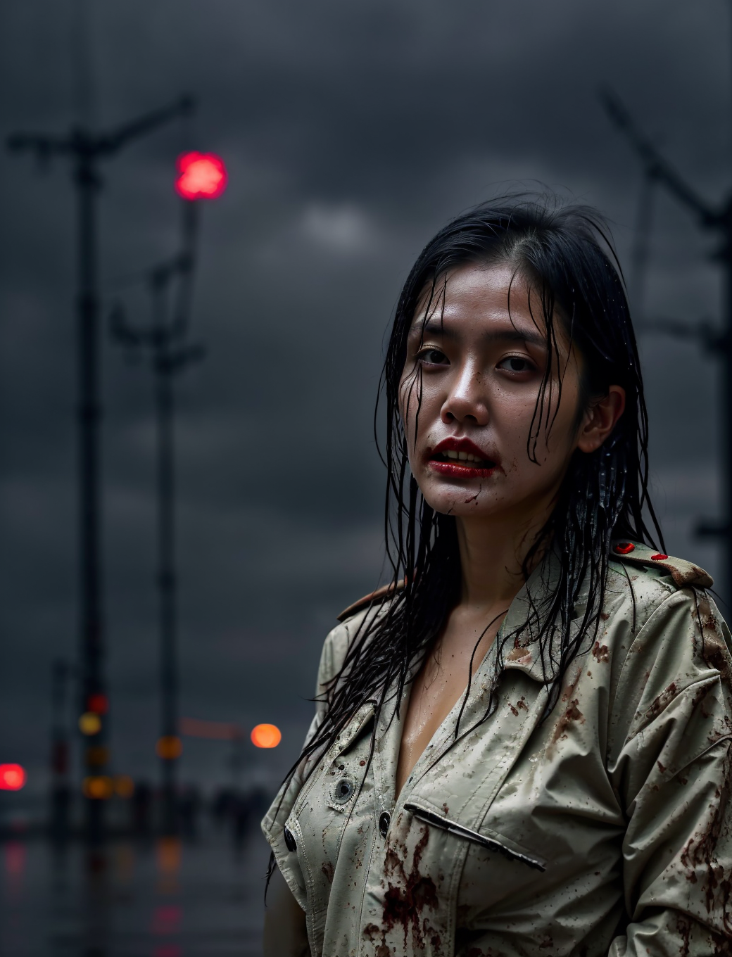 (((naturel asian 1girl))), wet hair , wet naked boobs, military sexy uniform , night city rain, (( zombie background)) , <lora:warhammer40commissarv2:0.8> <lora:realistic:0.5>