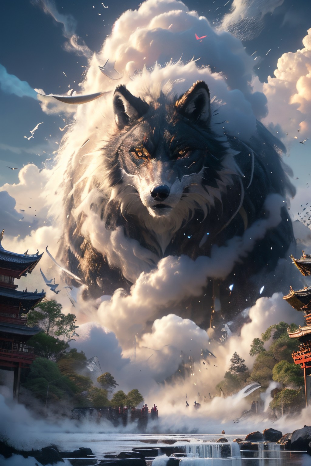 BJ_Sacred_beast,outdoors,horns,sky,cloud,bird,cloudy_sky,scenery,stairs,fantasy,architecture,east_asian_architecture,cinematic lighting,strong contrast,high level of detail,Best quality,masterpiece,<lora:Sacred_beast:0.8>,(black wolf:1.2),Fierce, wild
