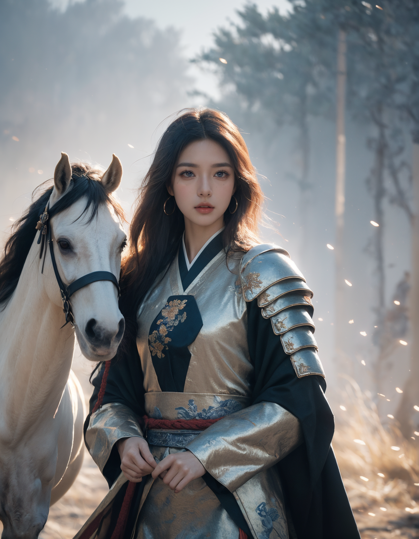 (Best Quality, Masterpiece:1.4), (Realism:1.2), (Realisitc:1.2), (Absurdres:1.2), (photorealistic:1.3), 1girl,Realistic Skin,Solo,( Very Big Eyes,beautiful detailed eyes, symmetric eyes), upper body,((cowboy shot)),battlefield, Chinese martial arts war scenes, a girl Chinese wearing blue and white porcelain armor, martial arts style, Chinese fairy tale,highly detailed, dynamic, cinematic, stunning, realistic lighting and shading, vivid, vibrant, octane render, unreal engine, very detailed, concept art, realistic, riding white horse , wind smoke ,Chinese Zen style,impactful picture, <lora:绪儿-骑马horse:0.6>