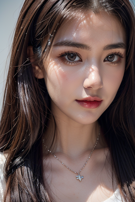 1girl, solo, looking at viewer, realistic, portrait, brown hair, long hair, lips, jewelry, necklace, closed mouth, eyelashes, nose, grey eyes, blue eyes,<lora:lin_face:0.75>,