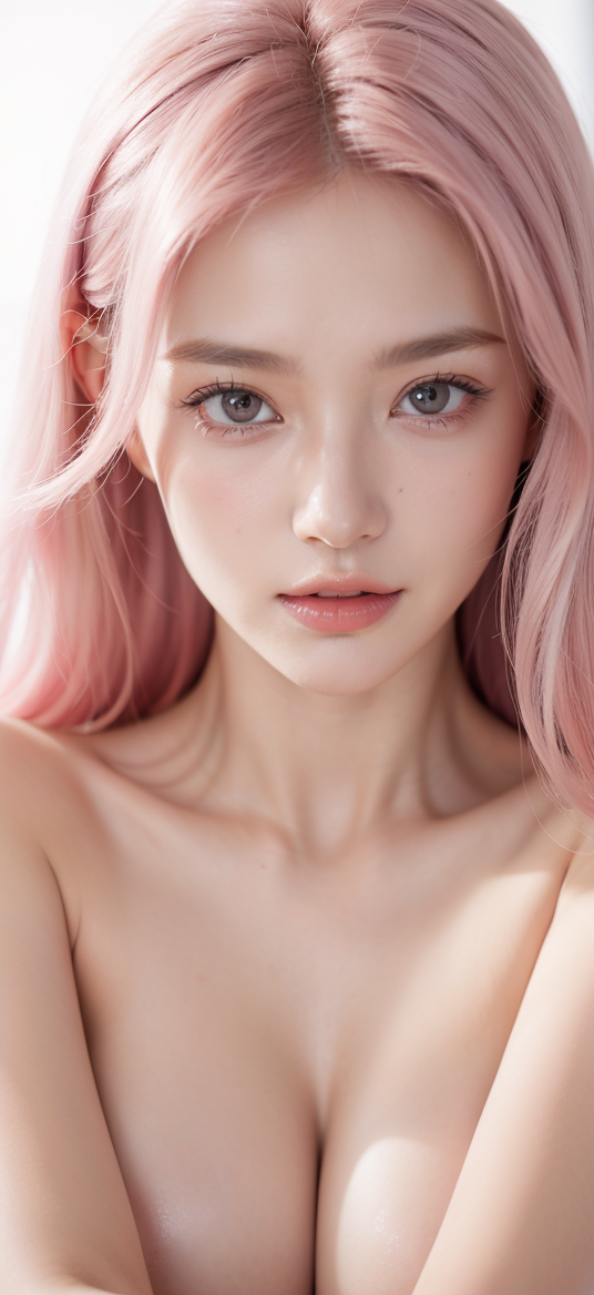 Please output an image that meets the following conditions. # Quality highest resolution possible, high quality, extremely detailed and realistic face # Subject 1girl # Features sheer-pink hair, delicate and beautiful facial features, charming, unmodified, pure, natural appearance, naked # Perspective close-up anus and eye and pussy and breast, looking at viewer # Style uncensored