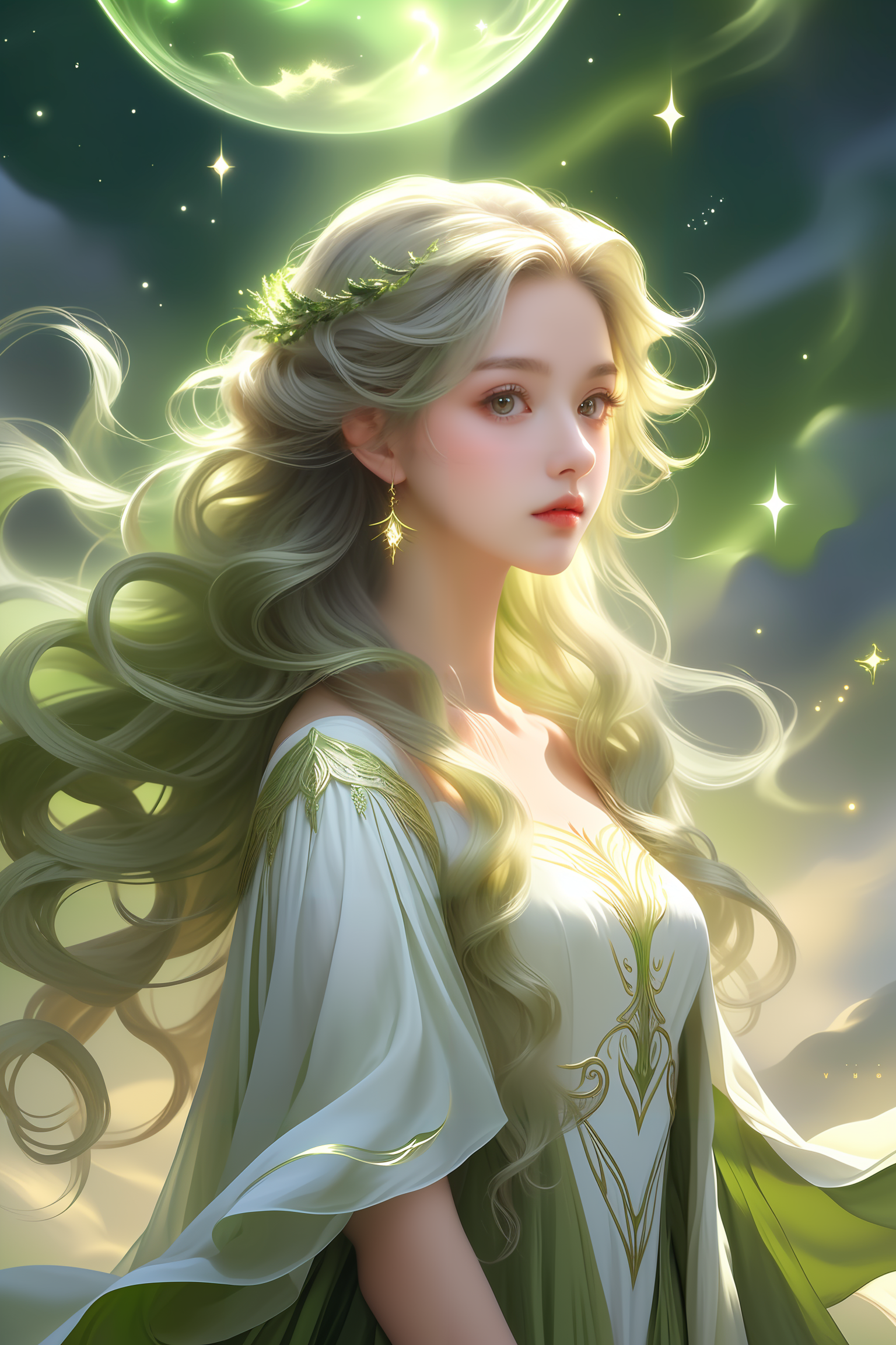 ethereal fantasy concept art of wide_shot,(masterpiece,best quality,niji style),white,dynamic pose,((olive green gradient background)),simple background,1girl,wavy hair,lip,((long hair)),light gray hair,<lora:xl_more_art-full_v1:1>,. magnificent,celestial,ethereal,painterly,epic,majestic,magical,fantasy art,cover art,dreamy,