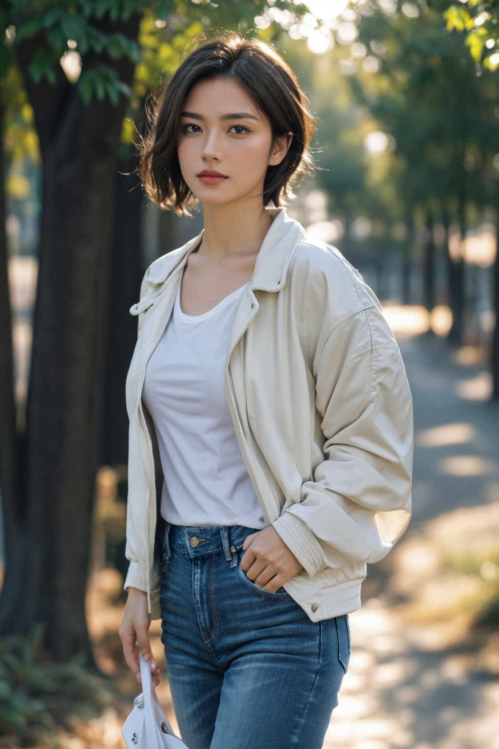 (best quality:1, high res, 4k, ultra res),(medium shot),1 girl, prefect skin, prefect body, beautiful, soft makeup, short hair, brown hair, soft smile, looking at viewer, (white t shirt, jeans jacket), (backlit:1), soft light, (dof:1.2, bokeh:1), trees, film, Fujifilm XT3, 50mm, f1.8, <lora:NegStd3:1> <lora:add_detail:0.5>