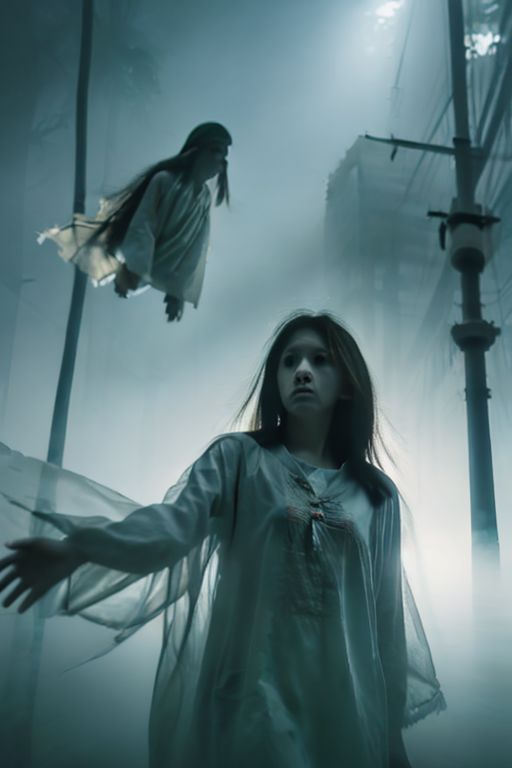 hight qualtiy, 1girl,long hair, breast, beautiful face, horror, ghost,misty, (((flying floating))) through hospital