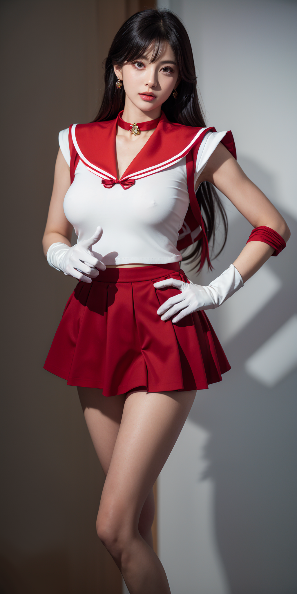 (masterpiece, best quality:1.2), ultra highres, 4k, 8k, (realistic, photorealistic:1.4), raw photo, (ultra perfect and beautiful face:1.4), (shiny skin:1.4), 1girl, dark eyes, eyeliner, eyelash, looking at viewer, huge breasts, full body, (tiasailor senshi uniform, white gloves,red sailor collar, red skirt:1.5),very long hair,hair with a hint of purple, <lora:sailor_mars_v1:0.5>