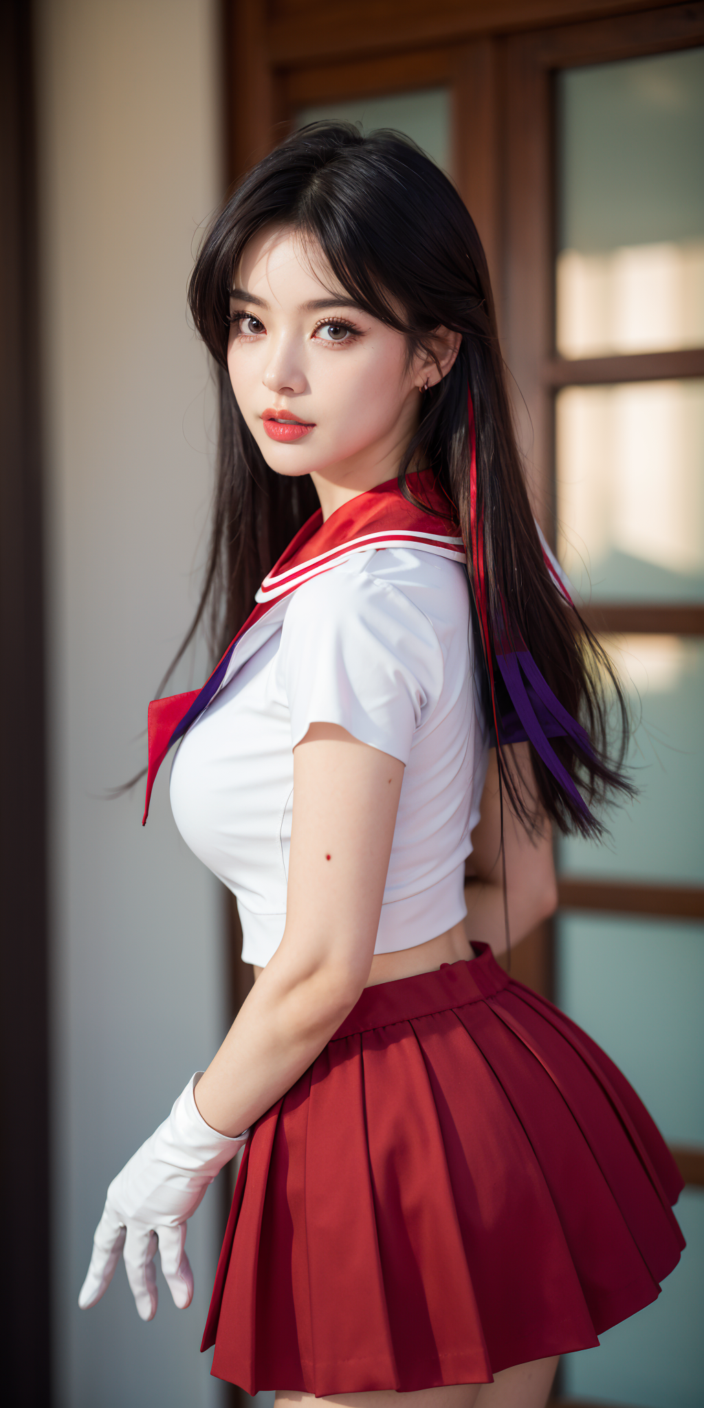 (masterpiece, best quality:1.2), ultra highres, 4k, 8k, (realistic, photorealistic:1.4), raw photo, (ultra perfect and beautiful face:1.4), (shiny skin:1.4), 1girl, dark eyes, eyeliner, eyelash, looking at viewer, huge breasts, full body, (tiasailor senshi uniform, white gloves,red sailor collar, red skirt:1.5),very long hair,hair with a hint of purple, <lora:sailor_mars_v1:0.5>